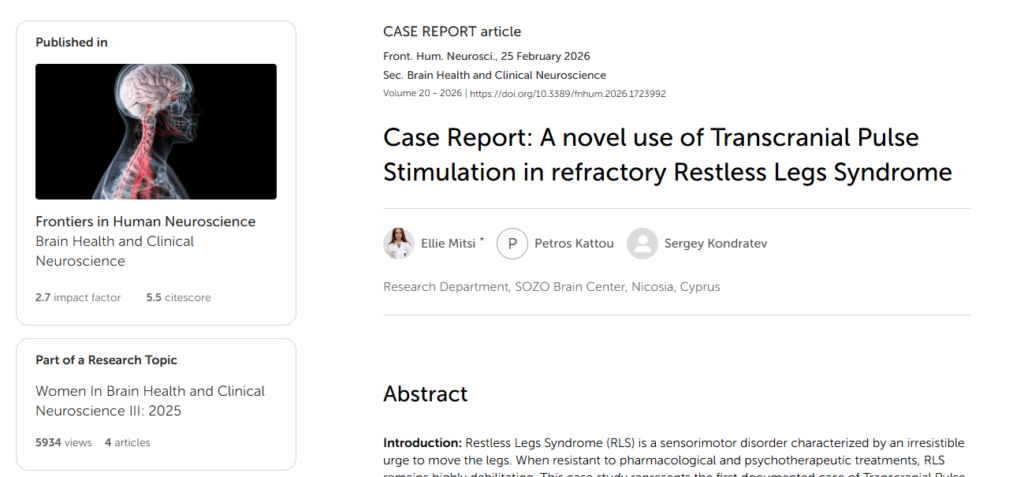 We are proud to announce that our Research Team has been published in Frontiers in Human Neuroscience, one of the world’s leading peer-reviewed journals in brain science. The case report, authored by Ellie Mitsi, Petros Kattou, and Sergey Kondratev, presents the first documented case of Transcranial Pulse Stimulation (TPS) applied in treatment-resistant Restless Legs Syndrome (RLS), exploring its feasibility, tolerability, and potential clinical effects.
